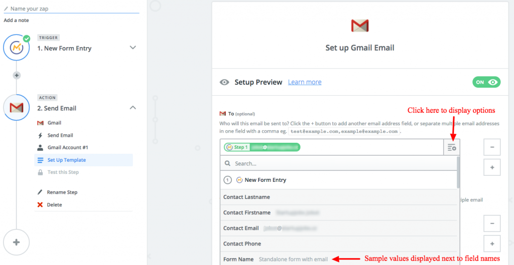 Ahora asigne los campos de TecnoMatic a los campos de la otra aplicación. En la imagen de abajo hay un ejemplo de cómo mapear campos de TecnoMatic desde el Activador de entrada de nuevo formulario de TecnoMatic a la acción Enviar correo electrónico de GMail.