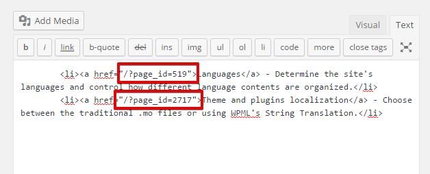 Los usuarios nunca verán estos enlaces «extraños». En su lugar, WPML insertará los enlaces permalink actuales al momento de mostrar la página.