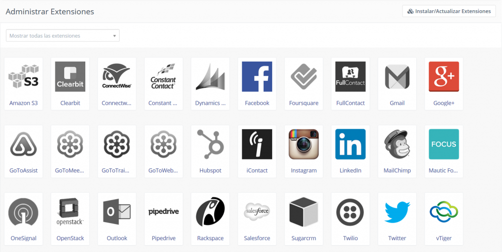 Si se encuentra en una instancia de TecnoMatic recién instalada, existe la posibilidad de que aún no tenga instaladas las extensiones predeterminadas. Haga clic en “Instalar/Actualizar extensiones” en la esquina superior derecha y todas las extensiones deberían aparecer. Si está intentando instalar una nueva extensión que no vino con los archivos de instalación originales de TecnoMatic y no aparece después de hacer clic en “Instalar/Actualizar” borre su caché de TecnoMatic e intente “Instalar\Actualizar” nuevamente.