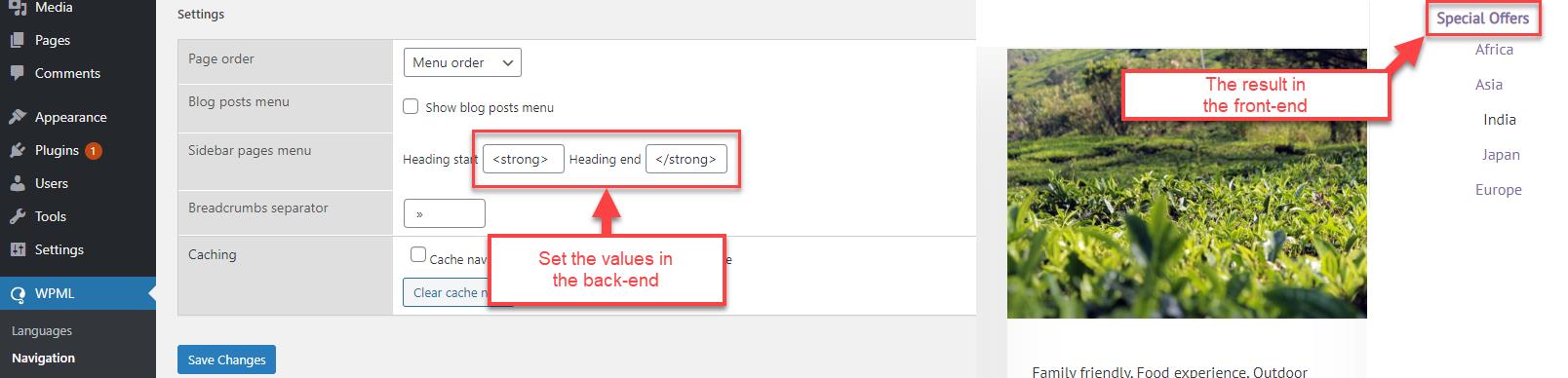 También, es posible personalizar el inicio y el final del título de la barra de navegación lateral. Estas opciones están disponibles en WPML → Navegación.