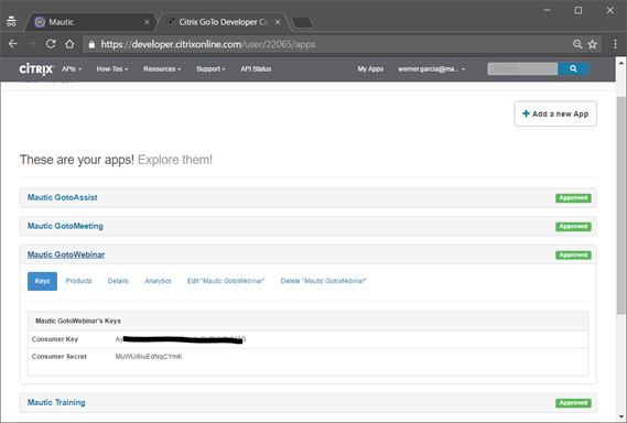 - Active los complementos con las claves de la API de desarrollador de Citrix