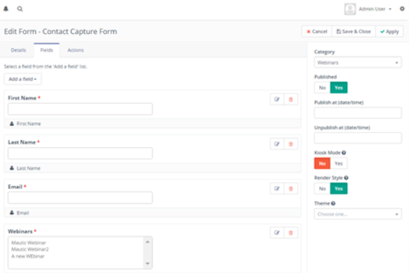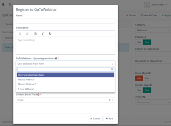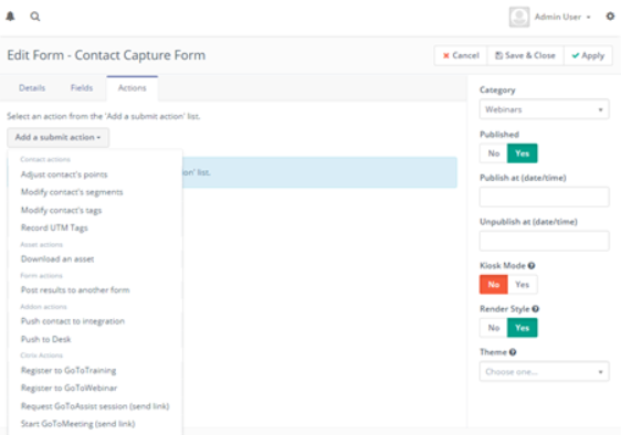 - Cada acción permitirá seleccionar un solo evento o permitir que el usuario lo seleccione desde el formulario. También se incluyen campos para mapear campos obligatorios de prospectos.