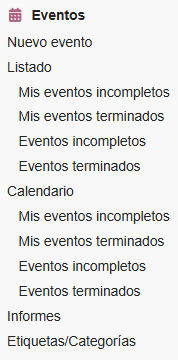 - Calendario: muestra la misma pantalla que cuando se ingresa al módulo, pero las opciones adicionales permiten listar tan solo los eventos que presenten un estado determinado (Mis eventos incompletos, Mis eventos terminados, Eventos incompletos y Eventos terminados).