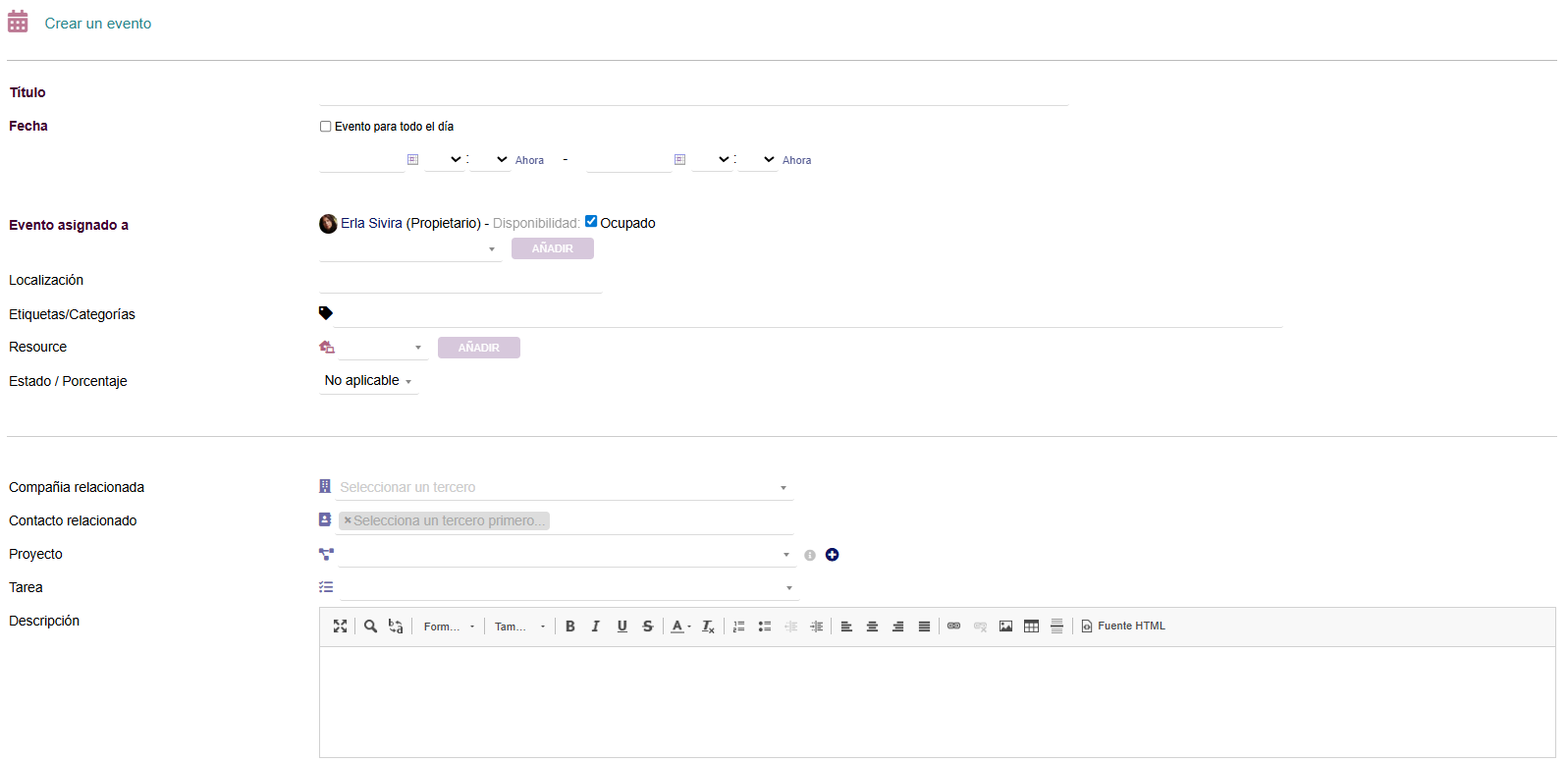 Una vez en esta pantalla, indicaremos el título del evento y su fecha. Además, podemos asignárselo a un usuario, relacionarlo con una empresa o con un proyecto, asignarlo a una Categoría, entre otros. Cuando hayamos rellenado todos los datos, pulsaremos sobre Añadir.