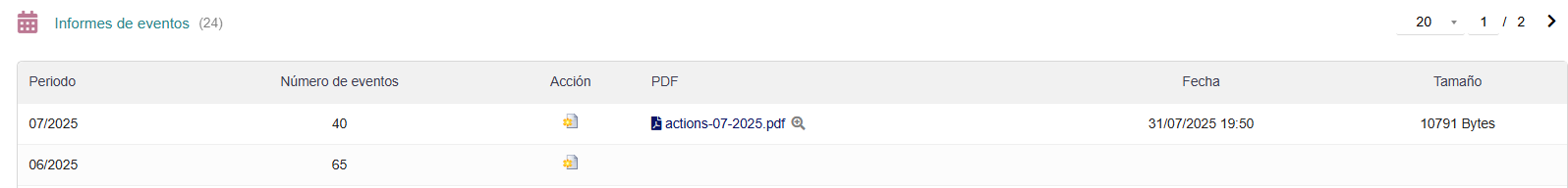 - Informes de Eventos: es posible consultar los informes del mes que se seleccione. Dicho informe mensual se puede generar y descargar en PDF.