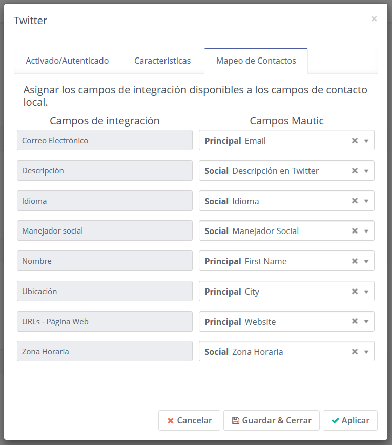 En la pestaña Mapeo de Contactos está la lista de campos disponibles de una integración. Tiene que seleccionar el campo equivalente del Contacto TecnoMatic para que cada campo obtenga el valor correcto. No tiene que mapear cada campo. Mapee solo aquellos que quiere empujar en la integración. Este es un ejemplo con el complemento de Twitter: