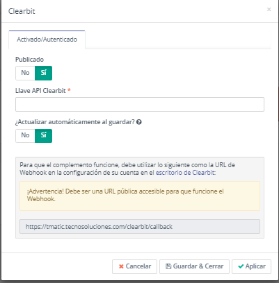 TecnoMatic instalado en una URL de acceso público. Este complemento no funcionará en un host local porque las devoluciones de llamada de Clearbit a TecnoMatic son necesarias.
