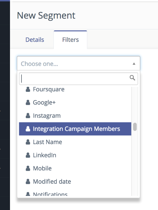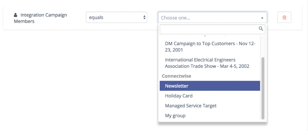 Puede crear una serie de segmentos compuestos de contactos que estén en un grupo de campaña de Connectwise. Para ello cree una opción de Miembro de la Campaña de Integración del filtro de segmento, luego en las propiedades de filtro seleccione el nombre del grupo de campaña del que desea obtener los miembros del grupo.