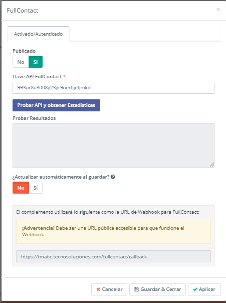 TecnoMatic instalado en una URL de acceso público. Este complemento no funcionará en un host local porque las devoluciones de llamada de FullContact a TecnoMatic son