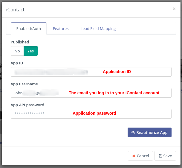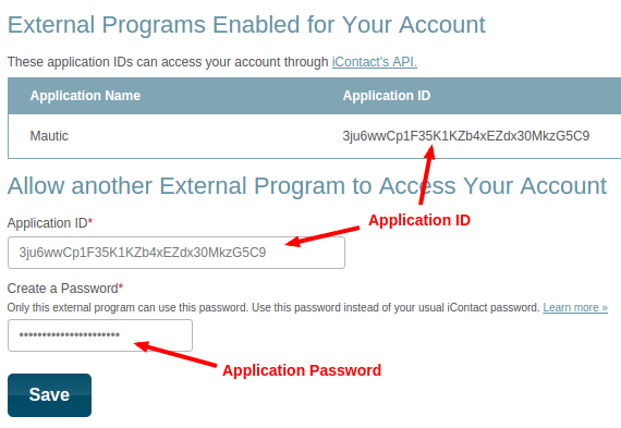 - Nombre de usuario de la aplicación = el nombre de usuario/correo electrónico que inicia sesión en su cuenta de iContact (No es el nombre de la aplicación).