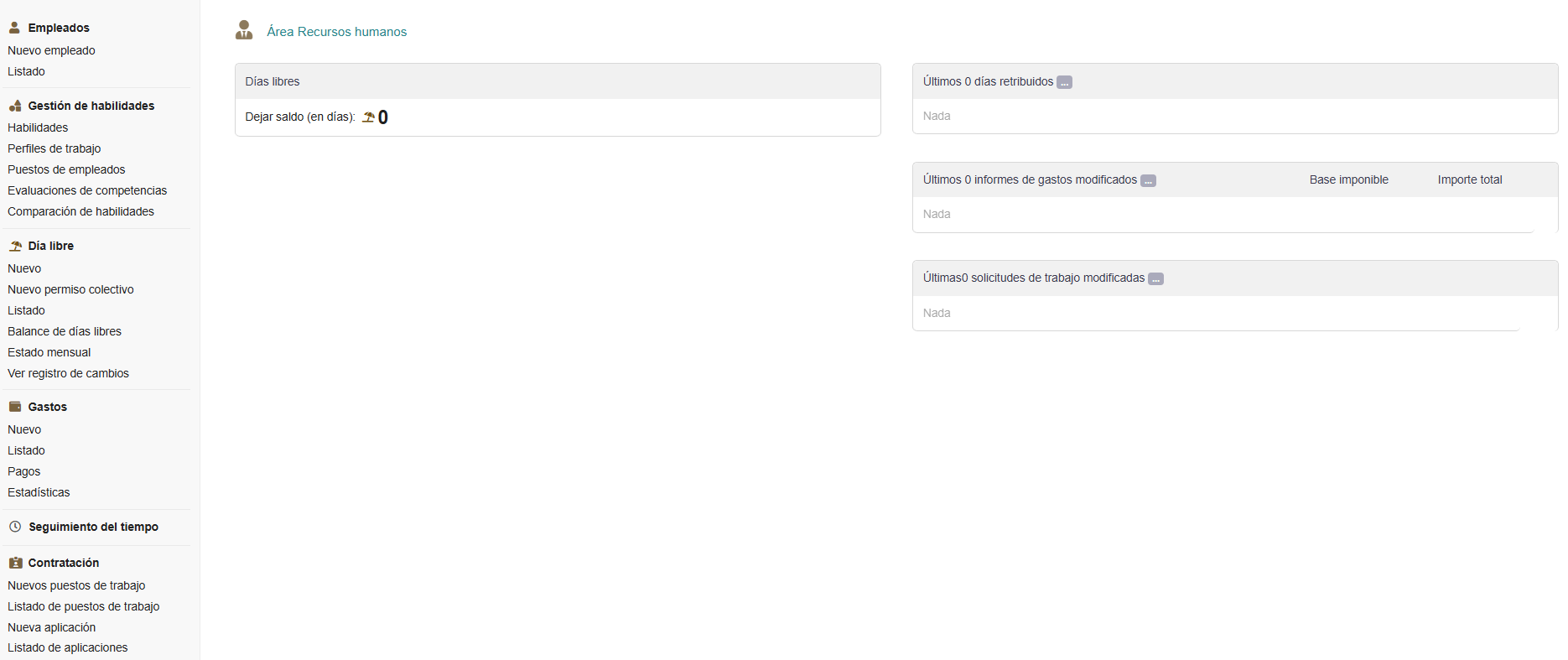 El módulo de Recursos Humanos (RRHH) del TecnoERP no es un único bloque, sino un conjunto de submódulos que cubren varias áreas clave de la gestión del personal: empleados, habilidades, ausencias, gastos y contrataciones.