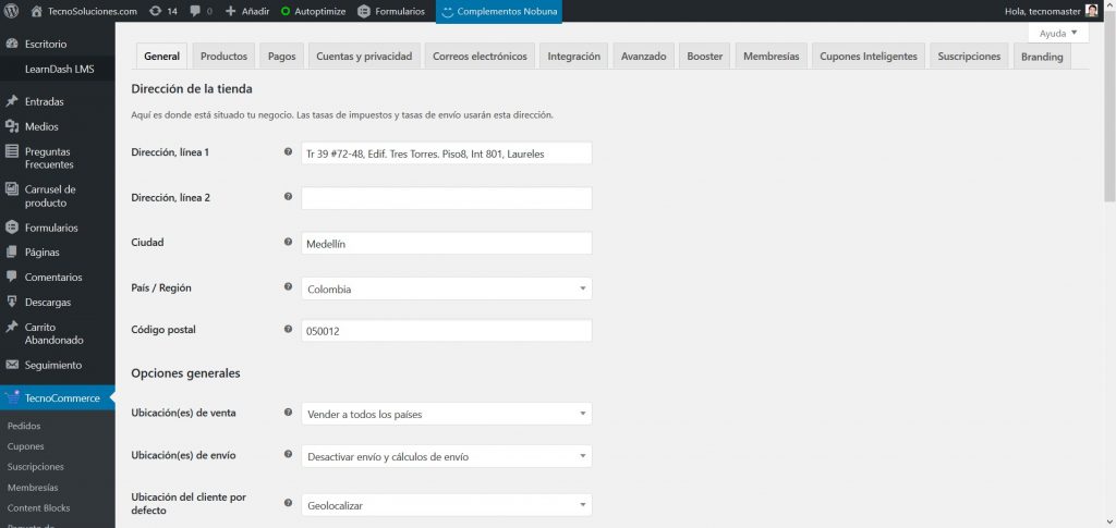 Lo primero que encontramos son las opciones generales, en los que podemos ajustar los aspectos más básicos de nuestro TecnoCommerce: