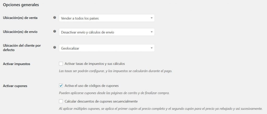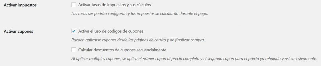 Activar el uso de códigos de cupones: Pueden aplicarse cupones desde las páginas de carrito y de finalizar compra.