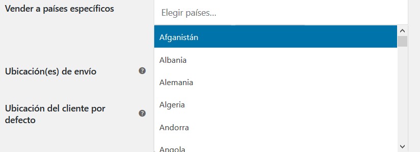La(s) ubicación(es) de venta es donde indicamos a qué países vamos a ofrecer nuestros productos. Por defecto viene marcada la opción “Vender a todos los países”, pero si seleccionamos “Vender a países específicos solamente”, nos saldrá una nueva casilla donde elegirlos: