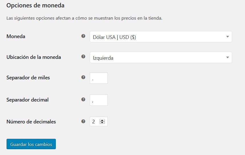 • Moneda: Divisa. En este caso, seleccionamos euros. Si queremos trabajar con más de una divisa, echad un vistazo al plugin múltiples monedas en WooCommerce