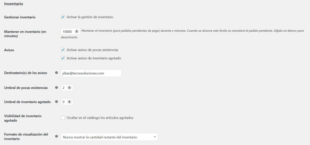 La página de opciones de inventario es la siguiente del menú de subpestañas, y nos ofrece ajustes relacionados con las existencias (stocks) de los productos, aquí la tenemos: