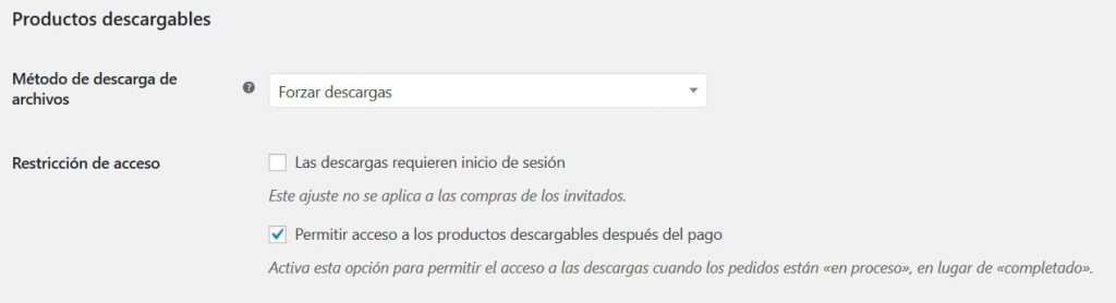 • Permitir acceso a los productos descargables después del pago: Esta opción permite que los clientes se descarguen el producto antes que se haya marcado como “completado”. Eso sí, sólo si se ha efectuado el pago correctamente.