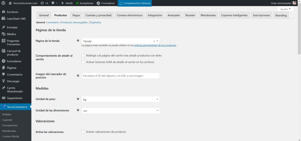 Los ajustes de productos los encontramos en el menú de “TecnoCommerce/Ajustes”, pestaña “Productos”. Ahí encontramos esta pantalla: