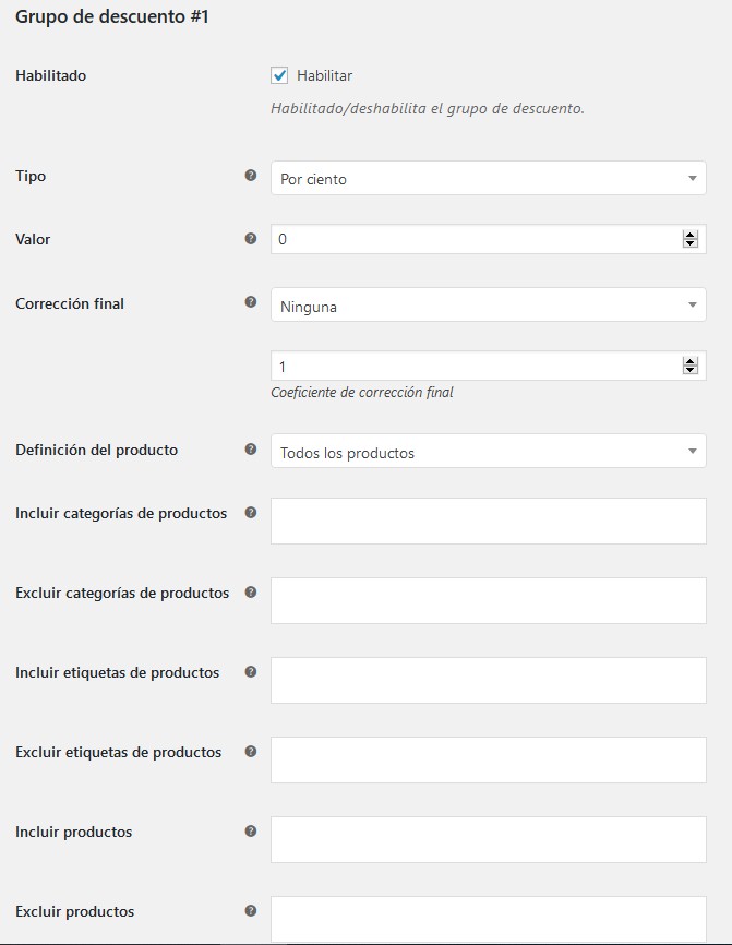 - Habilitado: Habilitado / deshabilita el grupo de descuento (Predeterminado: sí)