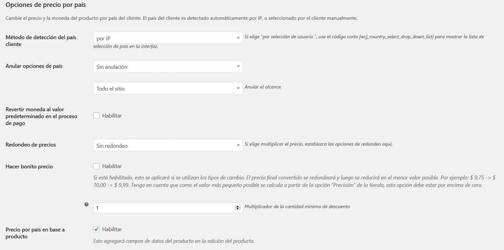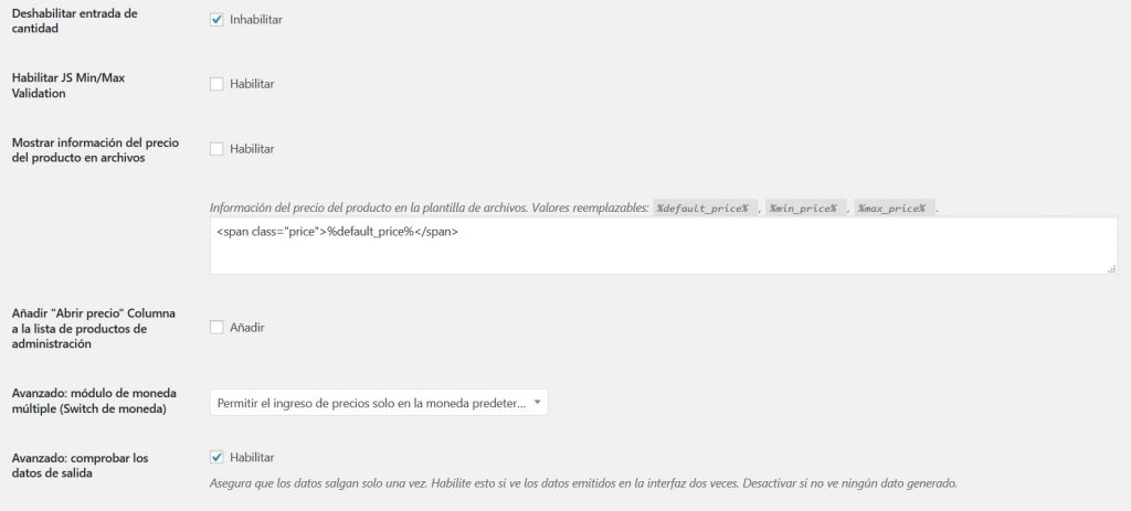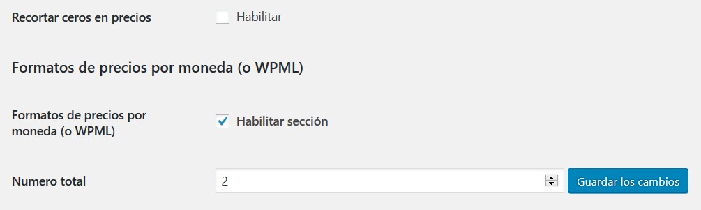 - Formatos de precios por moneda (o WPML): Habilitar / deshabilitar la sección (Predeterminado: si)