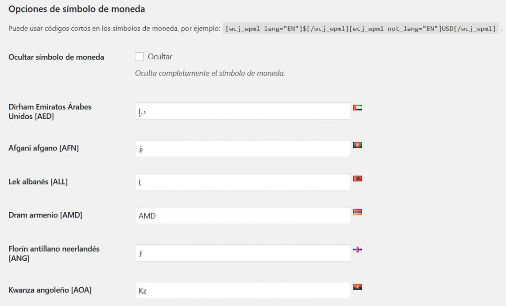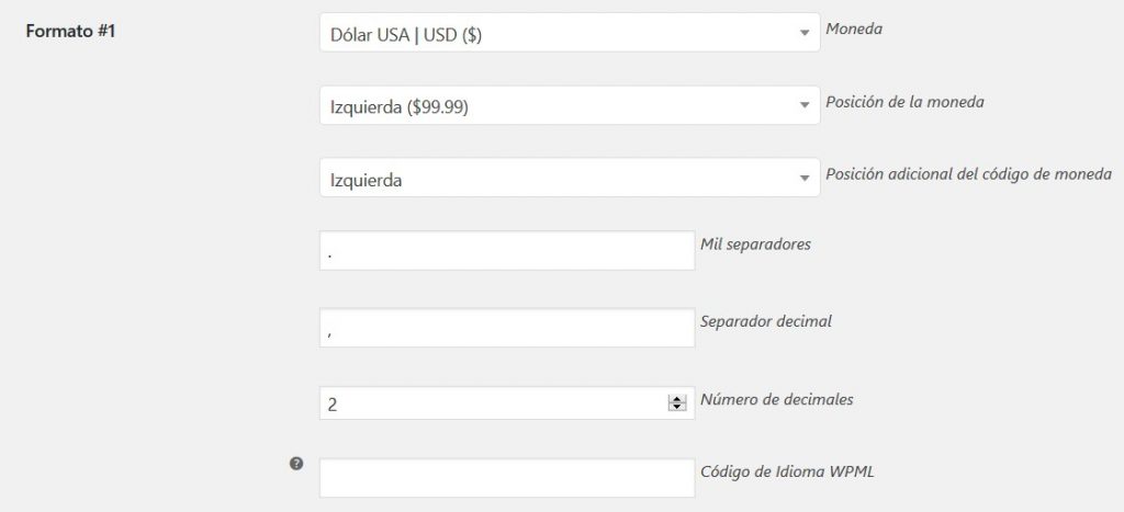 - Formato #N: Código de Idioma WPML. Opción para establecer diferentes formatos de precios para diferentes lenguajes WPML. Puede ser una lista separada por comas. Dejar vacío para deshabilitar (Predeterminado: Ninguno)
