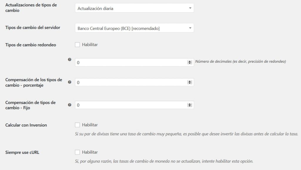 - Siempre use cURL: Si, por alguna razón, las tasas de cambio de moneda no se actualizan, intente habilitar esta opción (Predeterminado: no)