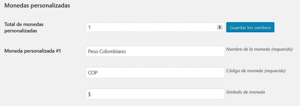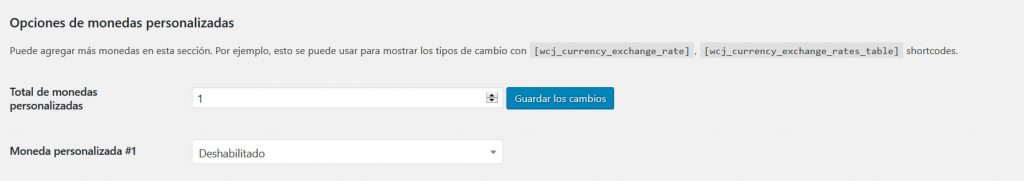 - Opciones de monedas personalizadas: Puede agregar más monedas en esta sección. P.ej. esto se puede usar para mostrar los tipos de cambio con los códigos cortos [wcj_currency_exchange_rate], [wcj_currency_exchange_rates_table].