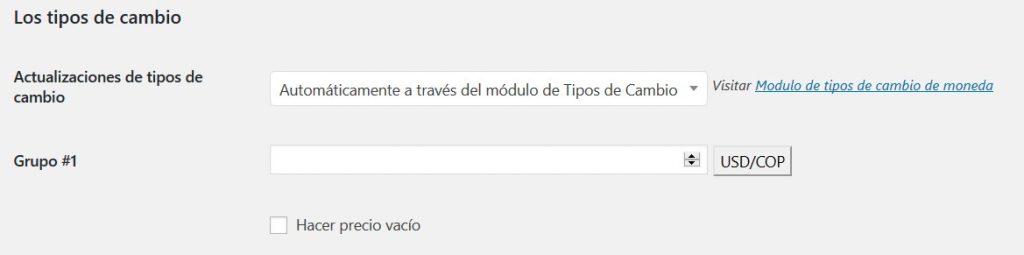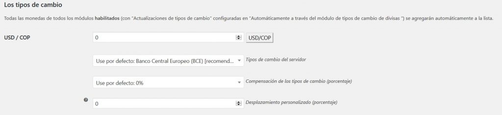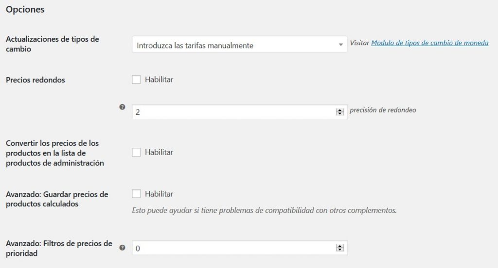 Opciones del módulo de tipos de cambio de moneda: