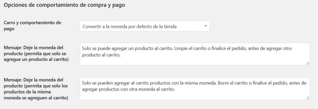 - Carro y comportamiento de pago: Presenta como opciones las siguientes: Convertir a la moneda por defecto de la tienda, Deje la moneda del producto (permita que solo se agregue un producto al carrito), Deje la moneda del producto (permita que solo los productos de la misma moneda se agreguen al carrito), Convertir a moneda del último producto en carrito, Convertir a moneda del primer producto en carrito (Predeterminado: Convertir a la moneda por defecto de la tienda)