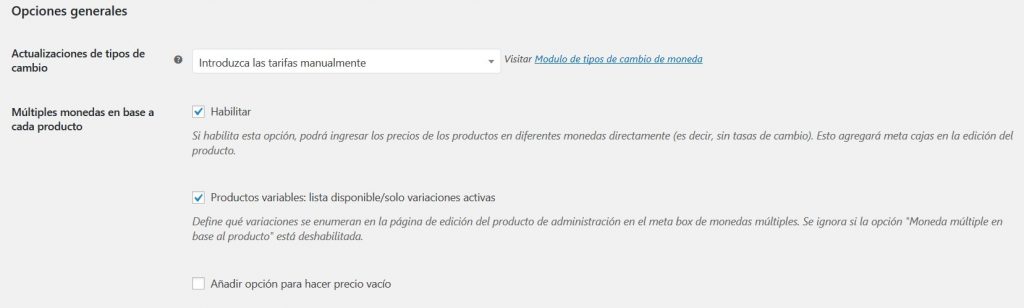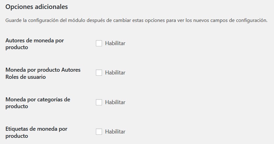 - Moneda por Producto: Al habilitarlo se agregará una “meta box” a la página de edición de cada producto (Predeterminado: Habilitado).