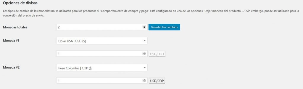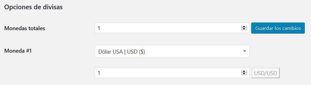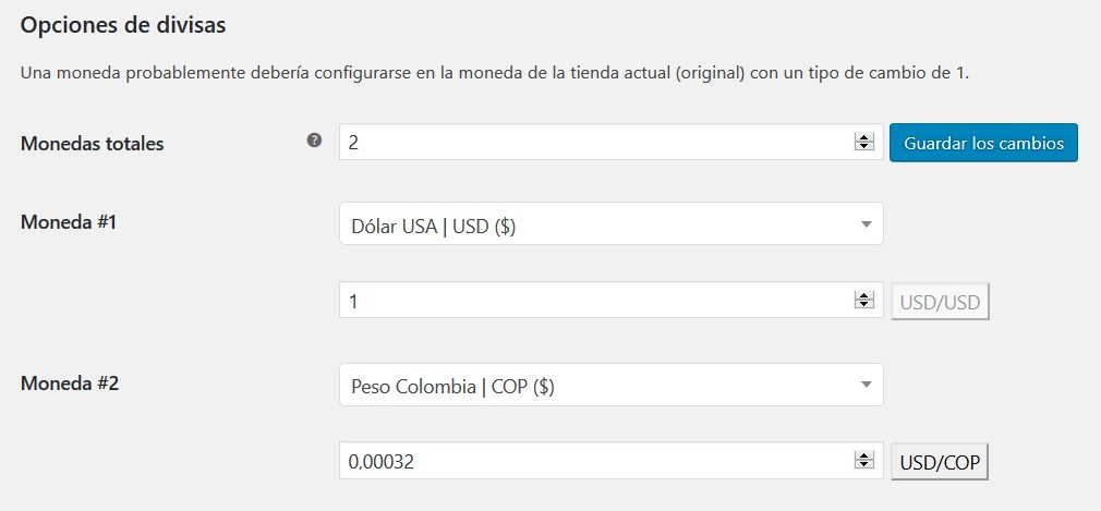 - Monedas totales: Establezca el número total de monedas aquí. Una moneda probablemente debería configurarse en la moneda de la tienda actual (original) con un tipo de cambio de 1. Presione Guardar cambios después de configurar esta opción, por lo que se agregarán nuevos campos de configuración (Predeterminado: 2)