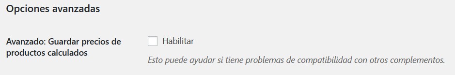 - Avanzado – Guardar precios de productos calculados: Al habilitarlo Esto puede ayudar si tiene problemas de compatibilidad con otros complementos (Predeterminado: Deshabilitado)