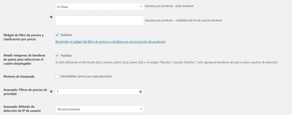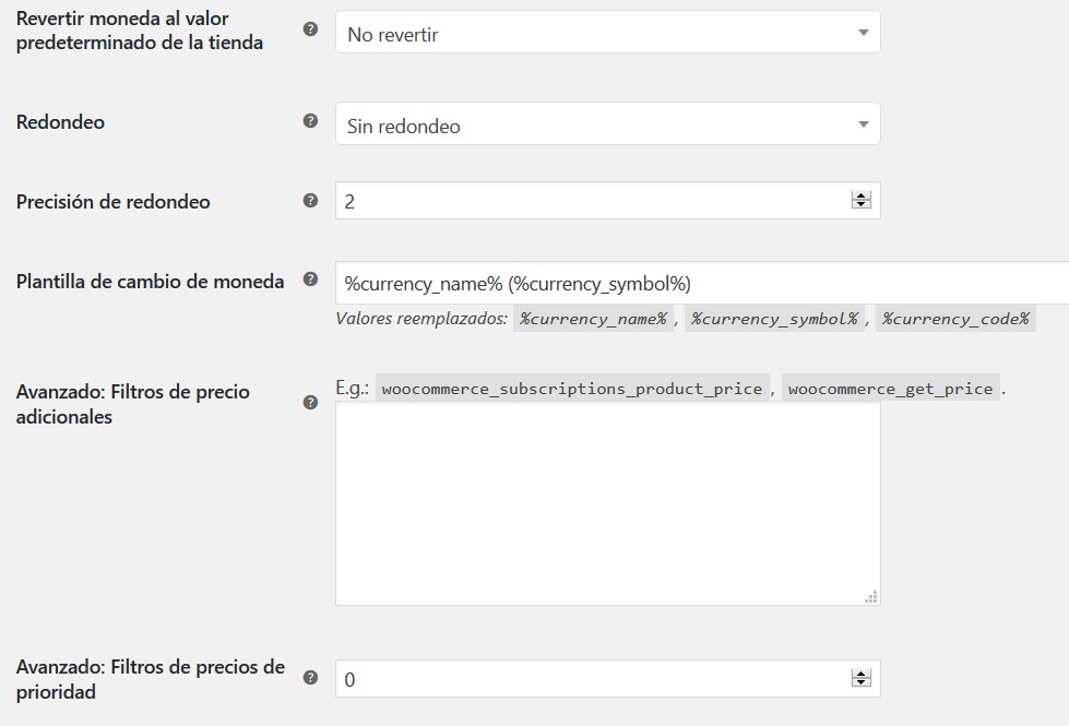 - Avanzado – Filtros de precios adicionales: Agregue filtros de precios adicionales aquí. Una por línea. Deje en blanco si no está seguro. Por ejemplo: woocommerce_subscriptions_product_price, woocommerce_get_price (Predeterminado: Ninguno)
