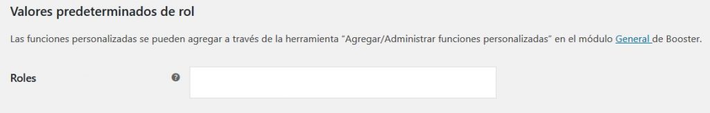 - Valores predeterminados de rol: Las funciones personalizadas se pueden agregar a través de la herramienta “Agregar/Administrar funciones personalizadas” en el módulo General de Booster.