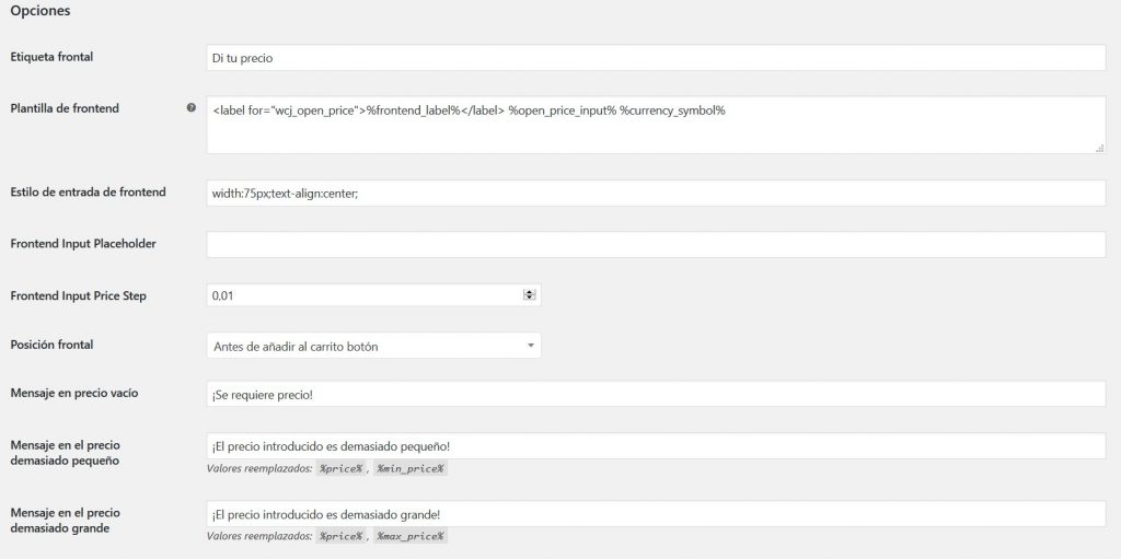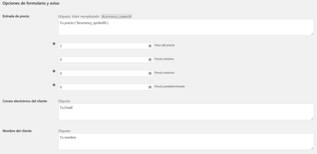 - Entrada de precio: Establecer etiqueta de campo de entrada de precio. Valor reemplazado: %currency_symbol% (Predeterminado: Su precio %currency_symbol%)