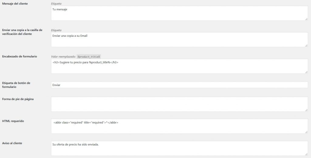 - Encabezado de formulario: Establecer la etiqueta del título del formulario (encabezado). Valor reemplazado: %product_title% (Predeterminado: sugiera su precio para %product_title%)