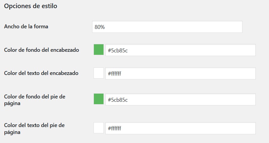- Color de fondo del encabezado: Establecer el color de fondo del encabezado del formulario (Predeterminado: # 5cb85c)