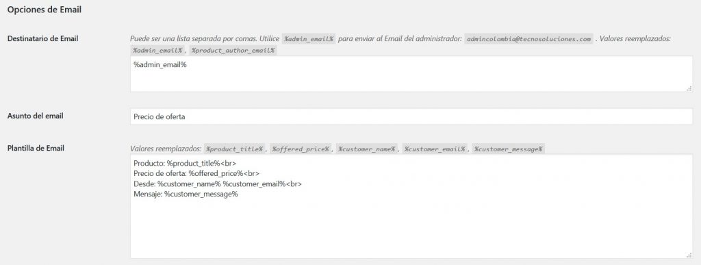 - Plantilla de correo electrónico: Cambiar el contenido del correo electrónico (plantilla). Valores reemplazados: %product_title%, %offers_price%, %customer_name%, %customer_email%, %customer_message% (Predeterminado: Producto: %product_title%, Precio ofrecido: %ofrecido_precio%, Desde: %customer_name% %customer_email%, Mensaje: %customer_message%)