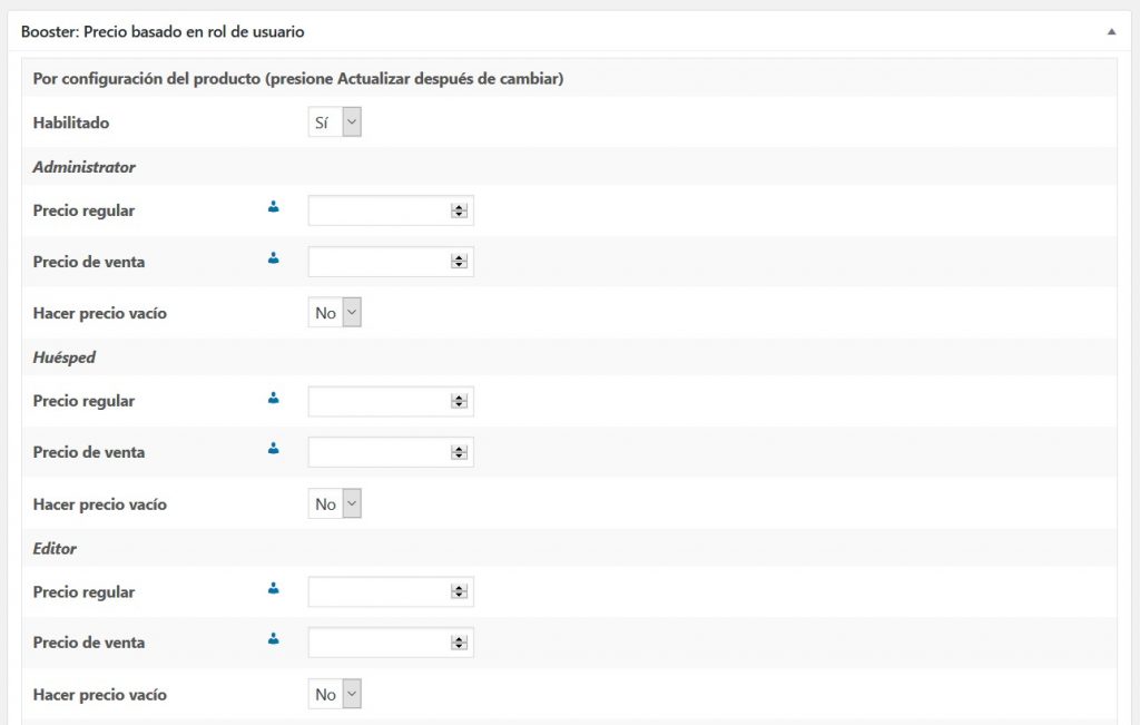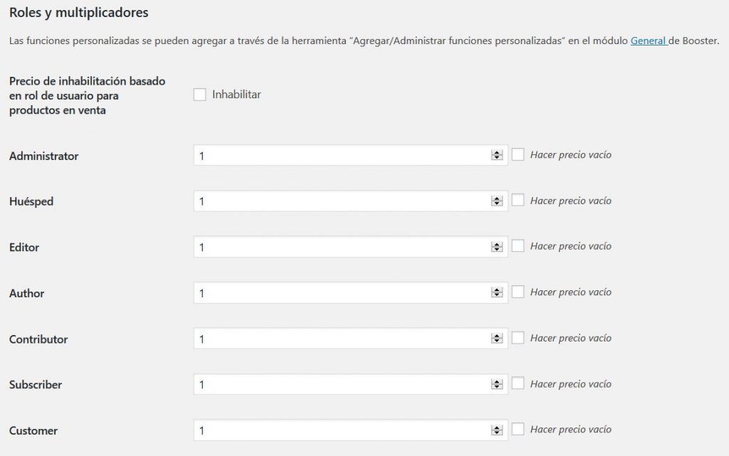 Con este módulo, puede establecer diferentes precios de productos para diferentes grupos de usuarios (roles). También hay una herramienta para crear roles de usuario personalizados en el Módulo General de Booster.