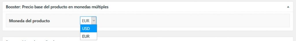 - Ahora vaya a la edición del producto, allí encontrará una nueva caja meta (metabox) que establece la moneda base del producto. Haga clic en Actualizar.