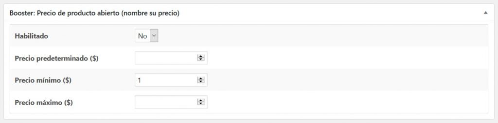 - En la caja meta, puede habilitar el precio abierto para el producto actual y, opcionalmente, establecer el precio predeterminado, precios mínimos y máximos.