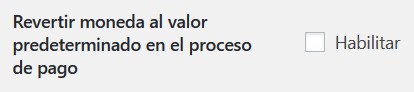 - Revertir moneda al valor predeterminado en el proceso de pago: Habilítelo si desea que los precios vuelvan a la moneda predeterminada de su tienda, cuando el cliente llegue a la página de pago (Predeterminado: no)