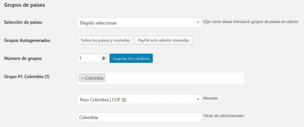 Para cualquier método de configuración, deben crearse primero los grupos de países. Los grupos de países se definen mediante una lista de países separados por comas y una moneda que se selecciona en el menú desplegable. Recuerde hacer clic en el botón Guardar cambios después de haber seleccionado una serie de grupos, de modo que aparecerán campos de grupos de países adicionales para que los complete.