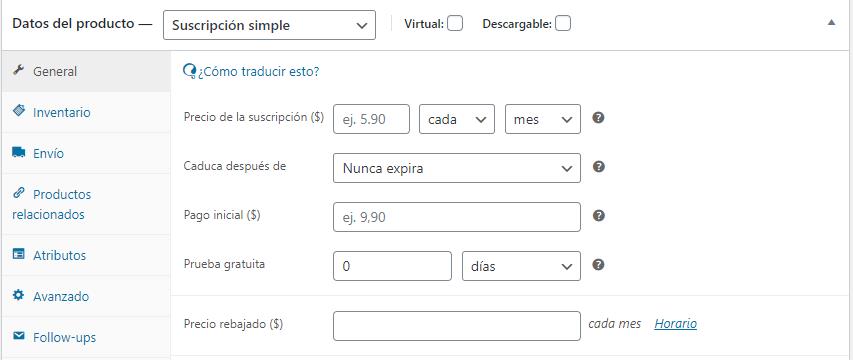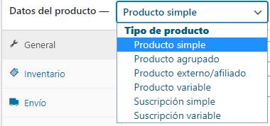 De igual forma se crean los productos de suscripción como un producto normal lo único que cambia es que dentro de las opciones Datos del producto se van a mostrar dos opciones nuevas que son Suscripción simple y Suscripción variable.