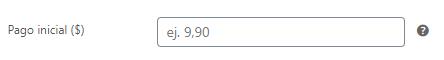 Pago inicial es una cantidad que se puede agregar al comienzo de una suscripción. Este pago inicial de registro es adicional a cualquier monto recurrente que haya establecido para el producto de suscripción. Por ejemplo, si crea un producto de suscripción por $ 75 por mes con pago inicial de $ 200, el total inicial de la suscripción durante el pago será de $ 275.