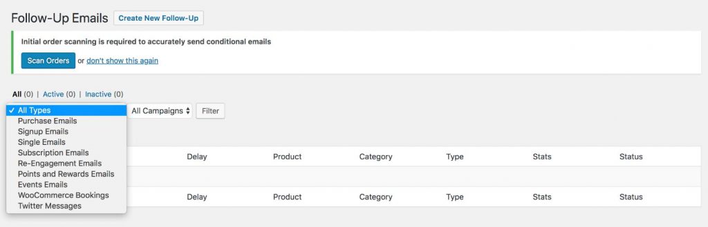 Todos los correos electrónicos que se muestran en la página de correos electrónicos de Emails de Seguimiento > correos electrónicos se clasifican por tipo de correo electrónico. Y cada tipo de correo electrónico está asociado con una extensión, lo que significa que algunos tipos de correo electrónico solo son visibles si ha instalado esa extensión, por ejemplo, suscripciones, reservas, eventos, Sensei, puntos y recompensas.