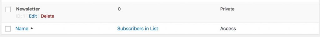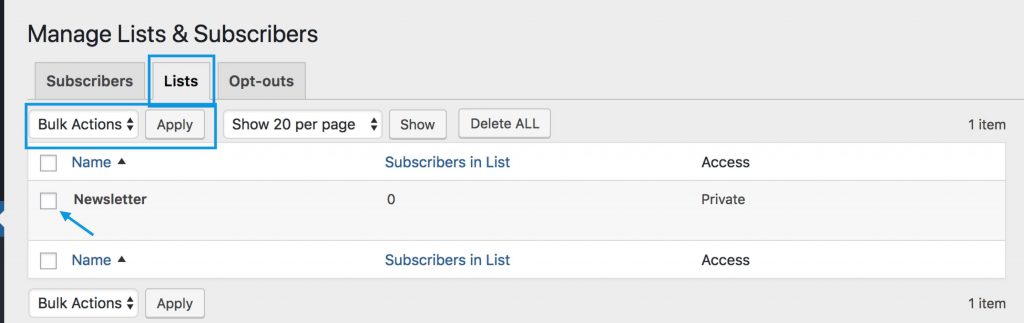 La pestaña Listas le permite administrar listas con suscriptores y orientarlas más finamente en campañas de correo electrónico o boletines de correo electrónico.