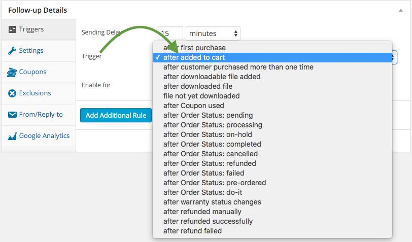 - Producto específico: el correo electrónico solo se activará si este producto específico se agrega al carrito