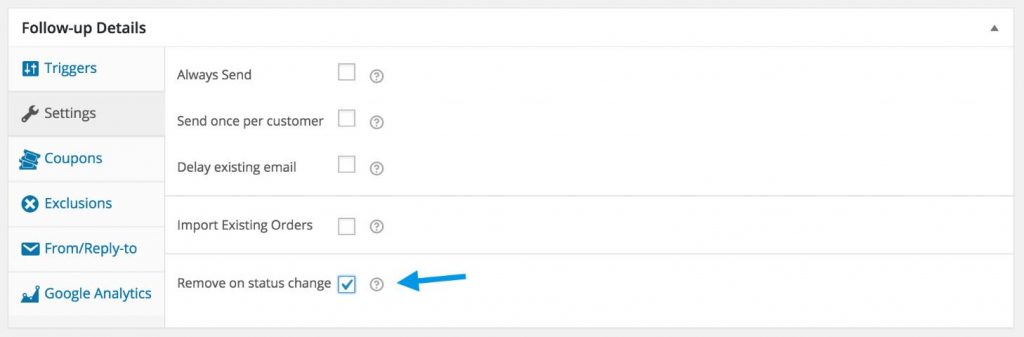 Ahora desea asegurarse de que este correo electrónico solo se envíe a las personas que abandonaron su carrito, pero no a quienes compraron el producto. Para hacerlo, vaya a: Configuración> Eliminar en cambio de estado y active esta función.