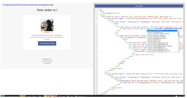 Puede usar los tokens en el constructor de modo de código cuando los escriba directamente. Por ejemplo, cuando escribe {contactfield=firstname} o puede seleccionarlos desde el menú desplegable. La lista desplegable se abrirá cuando presione CTRL+ESPACIO. Puede escribir para buscar el token que desea insertar.